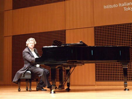ピアノ伴奏で雰囲気を盛り上げるマルツァガーリア氏。